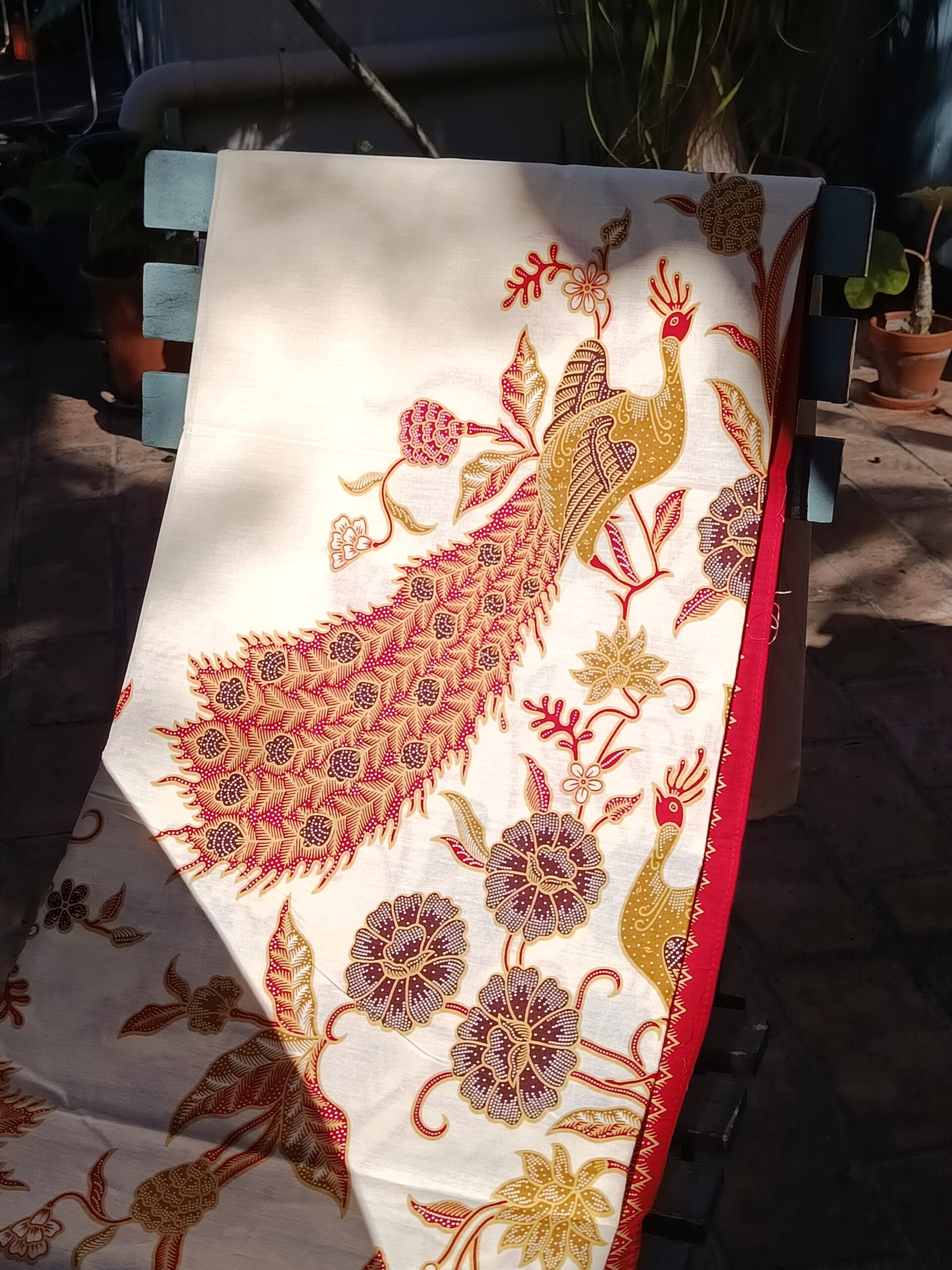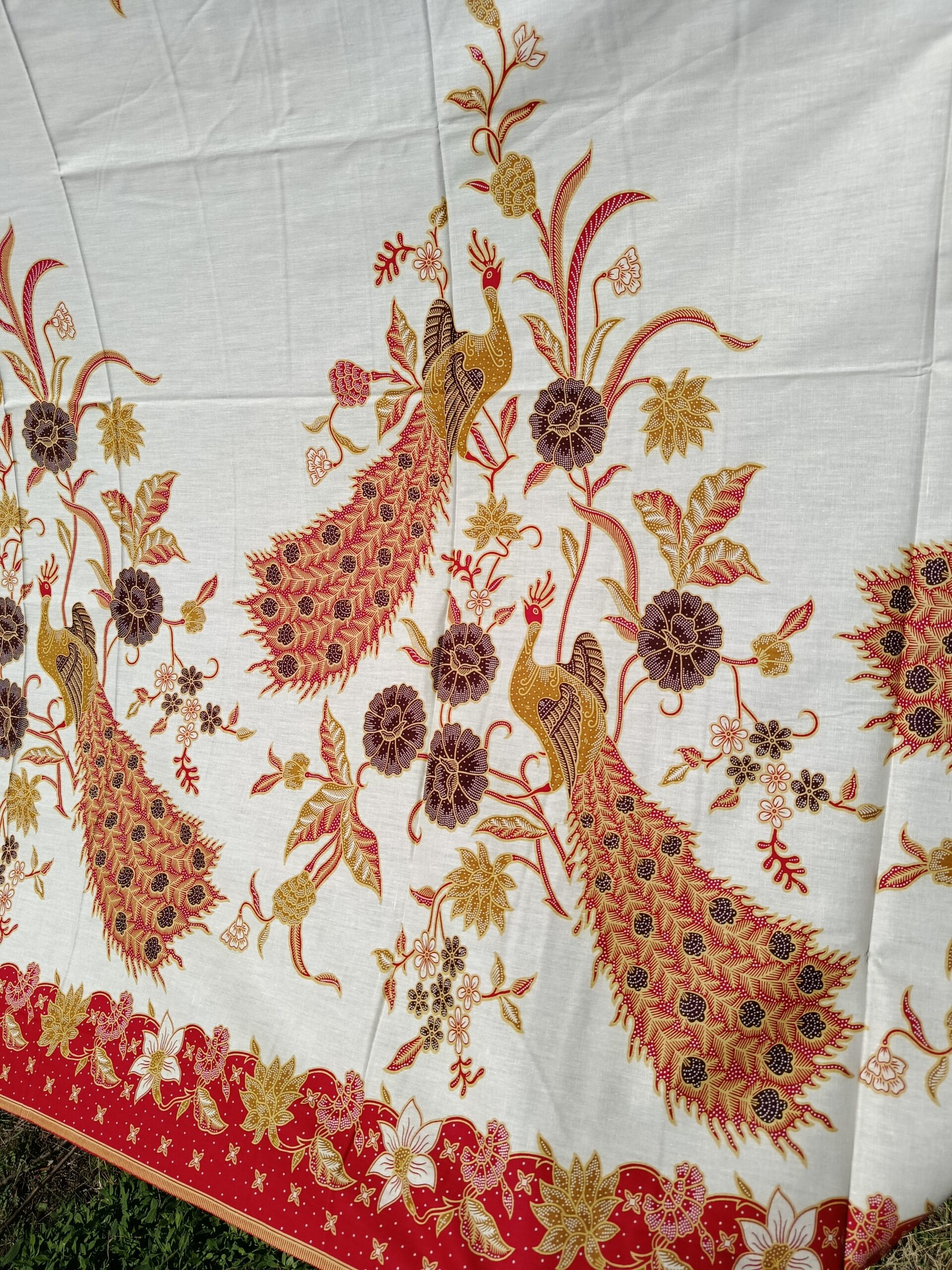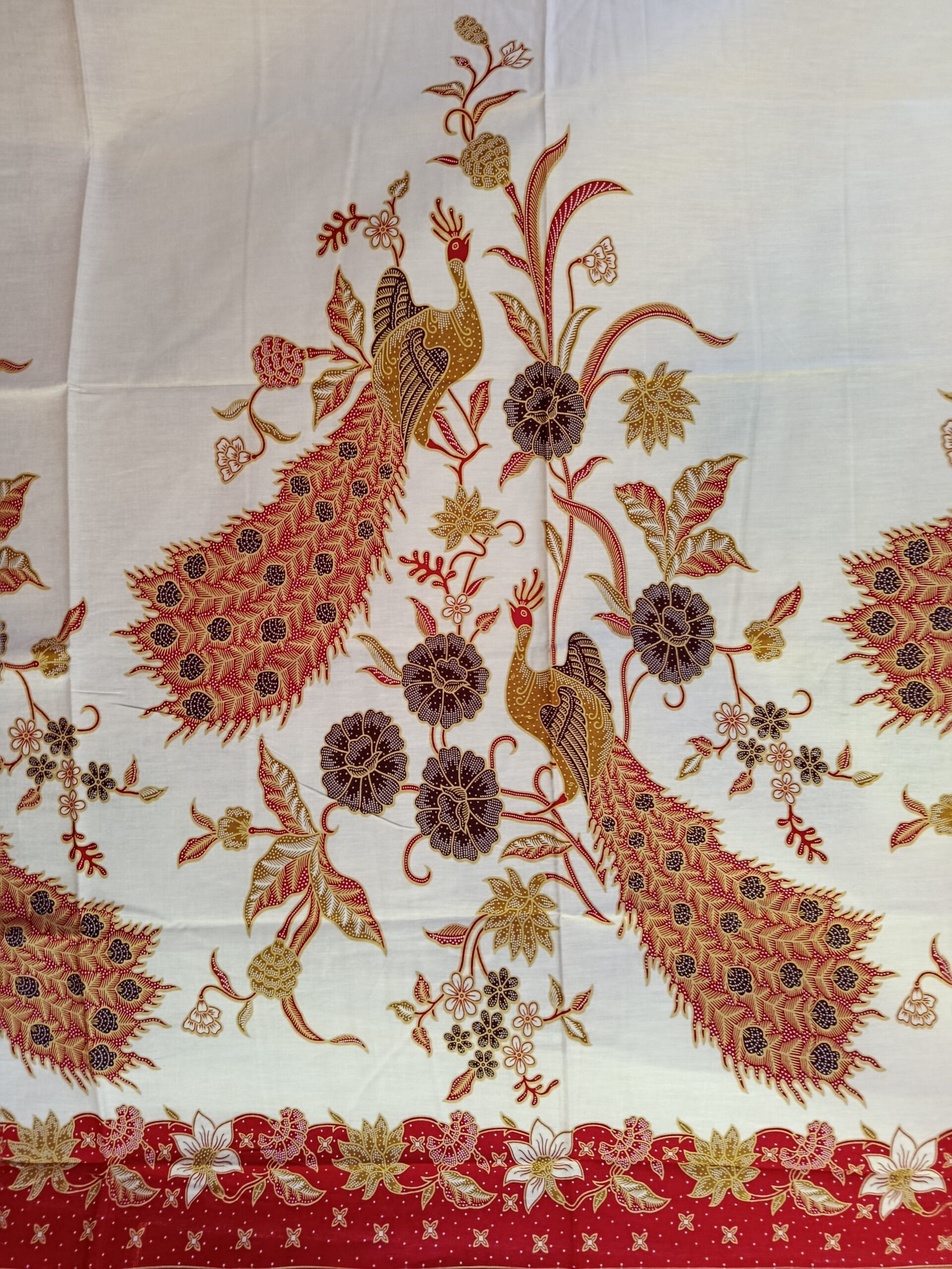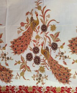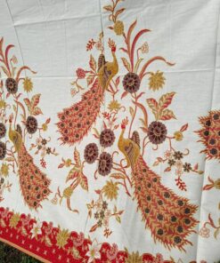 Coupon de coton imprimé dans le style du batik traditionnel, grands motifs de paons.